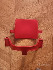 Seggiolone Stokke rosso completo di riduttore per i bambini piccoli, imbottitura del riduttore e della seduta. In diversi punti è andato via il colore.