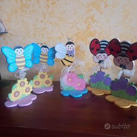 N. 5 segnatavoli in legno dipinti a mano per compleanno, battesimo e feste per bambini. Dimensioni: altezza cm 20, largh. base cm 11. Il prezzo è totale per il lotto.