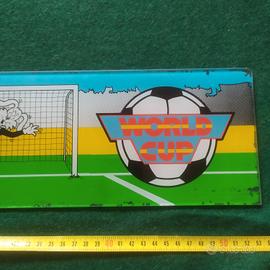 Si possono vedere una palla da calcio, una porta con la rete e la scritta "WORLD CUP" parzialmente visibile all'interno di un pallone stilizzato.