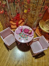 SERRA BARBIE GIARDINO DI INVERNO – 1987 serra con fontana che funziona davvero (ha una pompetta per far scorrere l’ acqua), tavolo con sedie per mangiare godendosi la bellezza dei fiori, tutti gli attrezzi necessari per la cura di fiori e piante e naturalmente tanta vegetazione in plastica
