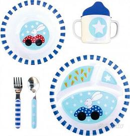 Set completo in melamina resistente con piatto, bicchiere, cupetta e posate – colorato e divertente per bambini 1–5 anni. Nuovo mai usato, ottima idea regalo di Natale.