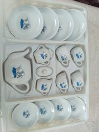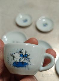 Servizio da tè in miniatura vintage in vera ceramica bianca decorata da graziosa anatra con fiocco azzurro. Il set comprende 17 pezzi di cui:
