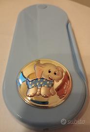 La confezione è azzurra. La lastrina è lucida in argento laminato e decorata con un elefantino.