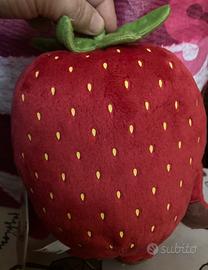 FRANCY FRAGOLA: colore rosso, foglia verde, mani e piedi marrone, occhi di plastica applicati e dettagli ricamati in giallo.