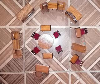 Esattamente come da foto, set 22 oggetti di arredamento sala da pranzo salotto, in miniatura, nuovo in perfette condizioni, mai usato, nella confezione originale(in condizioni discrete), vintage completamente in legno.