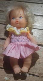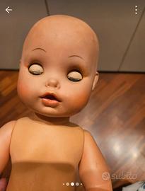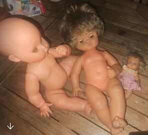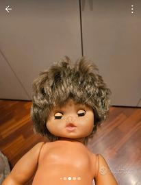 Set composto da 3 bambole, 2 nude senza abiti, la piccola con abito, 2 altezza 30/35 cm, possono essere vestite con abiti da neonato o da bambolotto. La femmina ha i capelli, il maschietto è pelato, entrambe hanno gli occhi movibili, che si chiudono quando si sdraiano. La terza bambola è piccola, altezza 18cm circa, rappresenta il bambino ed ha i capelli. Tutte risalgono agli anni 70.