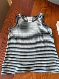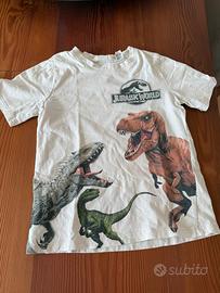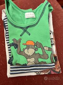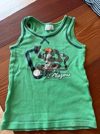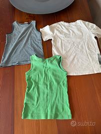 Set 3 pezzi di abbigliamento per bambino. 2 canotte e 1 maglietta. 1 canotta verde con disegno di una scimmia sul davanti, in cotone misura 98-104. Marca Berti 1 canotta a righe blu, azzurro e bianco. Marca Berti. In cotone misura 98-104. La maglietta è bianca con disegni dí dinosauri sul davanti. Marca H&M Iurassic World misura 4/6 anni. Usate in buone condizioni. Ottima vestibilita’ Vedi foto.