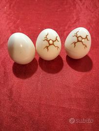 set 3 uova magiche che restano sempre in piedi, con simpatici disegni, altezza 4 cm diametro 3 cm