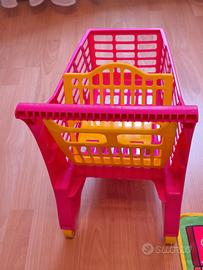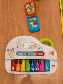 Set composto da un tappeto musicale animali fattoria, carrello spesa, scatola con frutta, verdura, piatti, tazze etc, telefono, cane Clementoni con canzoni, pianoforte Fisher Price,gioco Chicco DJ interattivo. Ottime condizioni, pile funzionanti.