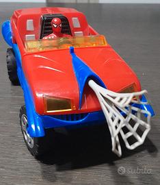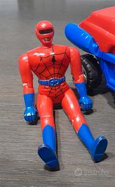Set composto da 2 giocattoli action figure di Spiderman uomo ragno in plastica, uno appoggiato ad un muretto ed uno che guida una macchinina.