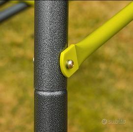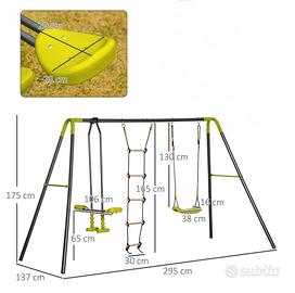 La struttura è dotata di un'altalena singola, un'altalena doppia ed una corda da arrampicata per far giocare contemporaneamente 4 bambini. Puoi regolare le corde di sospensione all'altezza che preferisci, facilmente e in poco tempo. La struttura a forma di A in acciaio garantisce la massima stabilità e sicurezza.
