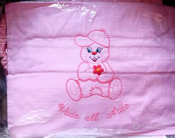 Set bimba per asilo, composto da bavaglino, sacchetto e asciugamano, con ricamo orsetto, spugna, puro cotone. Ultimo disponibile