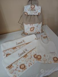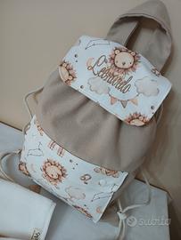 set asilo , realizzato a mano e personalizzabile, composto da una sacca zaino, un asciugamano e un bavaglino com tessuti di ottima qualità.
