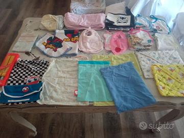 Vendesi vari set asilo per l'infanzia (sacche, buste, bavaglini, tovagliette, asciugamani...), nuove.