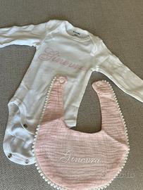 Dolcissimo set per neonata composto da: •Body bianco a maniche lunghe •Bavaglino in mussola con bordino decorativo 💖 Personalizzabile con nome (come in foto “Ginevra”) in elegante scritta. Perfetto per: 🎁 regalo nascita 📸 servizi fotografici newborn 🧸 corredino personalizzato 📏 Disponibile in varie taglie 🎨 Possibilità di scegliere colore scritta e bavaglino 🧵 Materiali morbidi e delicati sulla pelle del neonato ⏱ Realizzazione su richiesta 📦 Spedizione disponibile Scrivimi per creare il tuo set personalizzato!