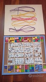 Set con perline in legno di varie forme e colori, lettere e fili per creare braccialetti.