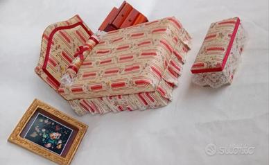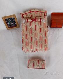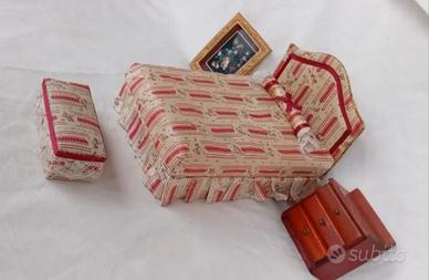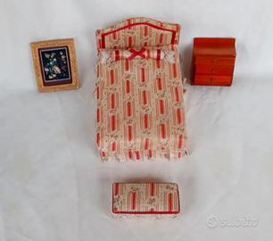 Set completo per la camera da letto di una casa delle bambole, con un design a righe rosse e gialle. - Letto con testiera imbottita e cuscino decorativo. - Comodino in legno con tre cassetti. - Panca decorativa imbottita con bordi in pizzo. - Quadro decorativo con fiori.