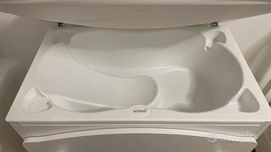 Set erbesi composto da cassettiera fasciatoio con vasca per bagnetto incorporarata. Lettino con sponde mobili, doghe e cassetto inferiore. Materasso alto ortopedico nuovo mai usato.