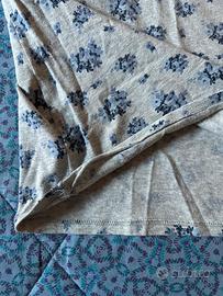 Coppia di canottiere in cotone, una bianca e un grigia, con stampa a fiorellini e merletto blu.