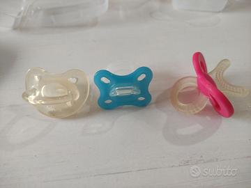 Un porta ciuccio della Mam, due ciucci (chicco e Mam), un massaggia gengiva e para capezzoli mai usati perché grandi.