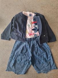 Set completo bambina, n. 4 pezzi, età 12 mesi, composto da: • 2 t-shirt manica corta colore rosa in cotone con decorazioni, marca Original Marines • 1 pantalone ampio in cotone lunghezza 3/4, ricamato sul fondo con bretelle rimovibili decorate, marca Original Marines, colore jeans scuro • 1 giacca in cotone con bottoni colore blu marca Mayoral.