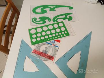Due squadre (45, e 60/30), goniometro 360, curvilinee e cerchiografo + riga da 50 cm (non presente in foto).