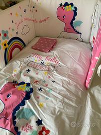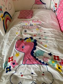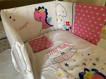 Set completo Piumone Tuc Tuc per lettino bimba 100% cotone + imbottiture laterali/paracolpi + federa. Perfetto per il lettino della bimba e molto ben fatti: la qualità si percepisce al tatto e dalla qualità delle immagini e dei colori. Le dimensioni sono 120X60 nella parte superiore (la forma materasso pr intenderci) e 140X70 agli apici del pimone in modo che sia comodo da rimboccare. Bellino veramente, usato per 2 mesi (la mia bimba è nata a gennaio), lavato e rimesso nella confezione originale. Ricordo che il set lo pagai circa 60 Euro