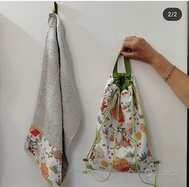 set coordinato composto da 4 pezzi, tessuto fantasia sui toni del verde, ideale per regalo e utilissimo per l'asilo nido.