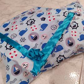 Creo a macchina copertina e federa per cuscino da culla/lettino in base alle tue richieste (colore, tipologia di tessuto, misure della copertina...), ideale per essere regalato. Scrivimi per informazioni, questa che vedi è solo una delle varianti che posso comporre. I tempi di lavorazione sono di circa 3 giorni dalla data di acquisto, poi spedirò il pacchetto.