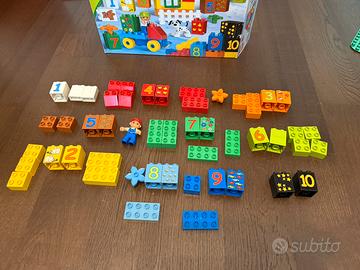 Set Duplo con costruzioni con numeri da 1 al 10 e blocchi colorati, perfetto per imparare i numeri in modo divertente e iniziare a costruire, include anche un personaggio e un animale oltre ad una macchinina su cui montare i diversi pezzi. Set INCOMPLETO, mancano diversi pezzi, alcuni sono stati sostituiti da pezzi complementari. Numero completi da 1 a 10 mentre dei blocchi con i disegni manca l’ora etto bianco e le mele del numero 6 che sono stati sostituiti con blocchi dello stesso colore ma senza disegno. Manca anche il carrello con ruote, il cane e il recinto, mentre il personaggio è stato sostituito. Sul profilo trovi diverse altre confezioni Duplo a prezzi incredibili, guarda tutte le inserzioni.