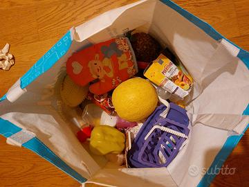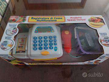 - cassa da supermercato con prodotti e soldi finti come in foto (gli accessori originali sono stati sostituiti con altri più nuovi). Il lettore di barcode fa bip e si illumina ad ogni passaggio. Scatola originale, perfetta per essere regalata.