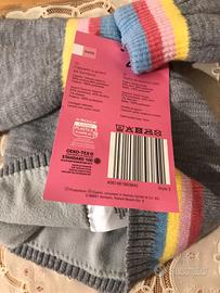 - Guanti in maglia grigia abbinati, anch'essi con dettagli arcobaleno.