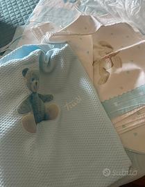 Set culla composto da: lenzuolo sopra, federa, piumone e paracolpi, copriletto in piquet.