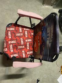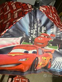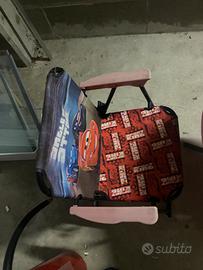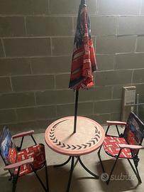 Set da giardino per bambini con il tema di "Cars"composto da un tavolo rotondo, due sedie pieghevoli e un ombrellone coordinato.