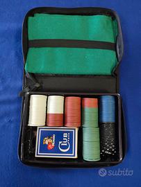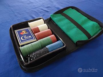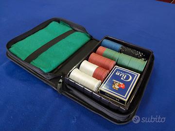 Vendo completissimo set da poker composto da carte da gioco fishes e panno verde racchiusi da una praticissima custodia da viaggio.