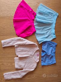 abbigliamento danza: 6 body, 2 gonne, 1 culotte, 1 calzamaglia, scaldamuscoli, 1 scaldacuore, scarpette