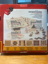 Raccolta di giochi legno mai usati: scacchi, dama, non t’arrabbiare, backgammon, alma, filetto, la volpe e le galline, due mazzi di carte, domino, mikado, dadi, ecc.
