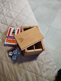Set di carte napoletane e sei dadi in un contenitore di legno.