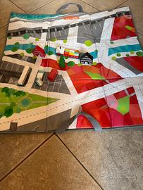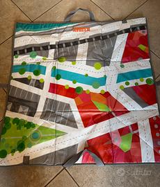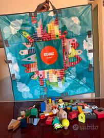 Vendo set originale Janod KUBIX, composto da numerosi blocchi di legno colorati di varie forme (case, edifici, veicoli, alberi, barche, ecc.) e da un pratico tappeto-gioco pieghevole con stampe di strade e paesaggi urbani.