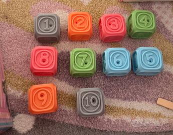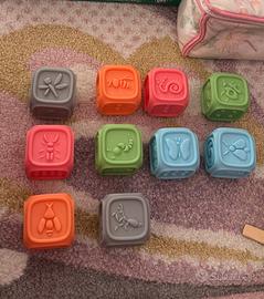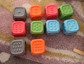 10 cubi didattici ed educativi con elementi in rilievo per giochi sensoriali; consigliati per bambini dai sei mesi; in gomma, possono essere messi in bocca e lavati
