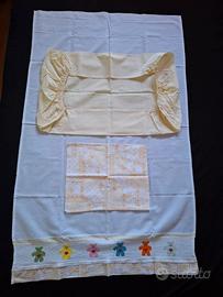 Vendo set di lenzuola gialle e bianche per la culla. Lenzuolo sopra ricamato a mano (misura 71,5 cm di larghezza e 122 cm di lunghezza), lenzuolo sotto con elastico e federa. In ottimo stato. Ritiro a mano o spedizione a carico dell'acquirente.