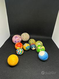 Collezione di 12 palline rimbalzine di diverse dimensioni, colori e fantasie (camouflage, stellate, psichedeliche, ecc.). Perfette per bambini o collezionisti vintage.