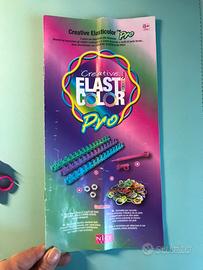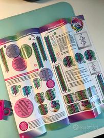 - numerosi elastici per braccialetti in 12 colori, - gancetti trasparenti di chiusura braccialetti. - telaio a tre strisce per costruire diversi modelli,
