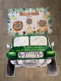 1 torta scenografica, 1 telo 120x180, una macchina di cartone piu telo con spazio viso per fare foto, due palloncini n 1, due festoni. Tutto in perfette condizioni. Euro 60 Fabrizio 340-5135543