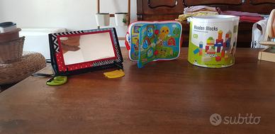uno specchio con animali disegnati attorno,un libro parlante e delle costruzioni in legno