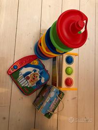 Libro musicale di stoffa, Palline colorate di legno con martello, Cubi da impilare a formare animali, Spirale da cui far rotolare palline.