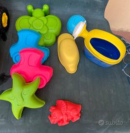 Set di giochi mare, usati ma ben tenuti, composto da: 4 secchielli di diverse misure, 4 palette e 1 rastrello, 1 annaffiatoio, 5 formine, 2 scodelline, un camion (la parte superiore si stacca perché si sono rotti i perni ma si può usare comunque), un carrello capiente perfettamente funzionante per trasportare i giochi, un sacco per contenere i giochi piccoli ed evitare l'accumulo della sabbia.