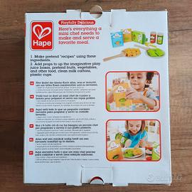 Come da foto il set contiene 3 confezioni di pasta (in feltro) di diverso tipo (penne, farfalle e ravioli), 2 forchettine in legno, 2 piattini, 2 barattolini di salse (in legno) e una busta per il take away.