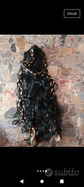 set halloween composto da vestito, parrucca Mona Lisa lunga e riccia, cappello strega, candelabro a teschio e palloncino con all' interno pipistrelli di carta