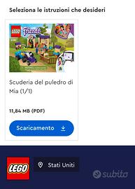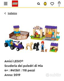 Set Lego n 41361 Scuderia dei puledri di Mia (Lego friends – amici Lego) Set utilizzato per giocare quindi non adatto a chi li cerca nuovi per collezionismo. Sprovvisto di scatola. Alcuni pezzi di quelli comuni (blocchi colorati semplici) potrebbero essere di altra marca. Alcuni omini potrebbero avere difetti (ad esempio testa che si stacca facilmente). In caso di pezzi differenti dal set di origine (es pezzi di colore diverso o rotti) verrà scritto in annuncio. Riceverete quanto inserito in annuncio e presente in foto. I set possono essere spediti montati o smontati su richiesta, tuttavia li spedisco già montati SOLO a chi me lo chiede in modo da poter mettere la misura adeguata per la spedizione. Completo di istruzioni. Cavallino nero e carota dell’ultima foto in regalo. Spazzolina azzurra mancante. Altri set presenti tra i miei annunci. Sconti disponibili in caso di acquisto di più set.